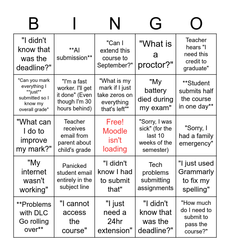 This bingo card has a free space and 24 words: Panicked student email entirely in the subject line, "I cannot access the course", "What is my mark if I just take zeros on everything that's left"", **Problems with DLC Go rolling over**, Teacher hears "I need this credit to graduate", "I didn't know that was the deadline?", "Can you mark everything I **just** submitted so I know my overall grade", **AI submission**, "Sorry, I was sick" (for the last 10 weeks of the semester), "I didn't know I had to submit that", "My battery died during my exam", "What can I do to improve my mark?", Tech problems submitting assignments, "I just used Grammarly to fix my spelling", "I'm a fast worker. I'll get it done" (Even though I'm 30 hours behind), "I didn't know that was the deadline?", "Sorry, I had a family emergency", "Can I extend this course to September?", **Student submits half the course in one day**, Teacher receives email from parent about child's grade, "How much do I need to submit to pass the course?", "My internet wasn't working", "What is a proctor?" and "I just need a 24hr extension".