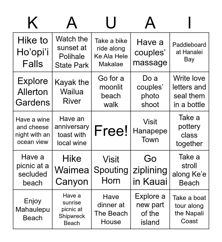 This bingo card has a free space and 50 words: Watch the sunrise at Poipu Beach, Take a boat tour along the Napali Coast, Recreate your first date at Hanalei Bay, Have dinner at The Beach House, Hike Waimea Canyon, Snorkel at Tunnels Beach, Watch the sunset at Polihale State Park, Take a helicopter tour, Explore Allerton Gardens, Visit Queen's Bath, Kayak the Wailua River, Have a couples’ massage, Take a stroll along Ke’e Beach, Go ziplining in Kauai, Share shave ice at JoJo’s, Have a beachside candlelit dinner, Go for a moonlit beach walk, Visit Hanapepe Town, Take a cooking class together, Paddleboard at Hanalei Bay, Have an anniversary toast with local wine, Explore a new part of the island, Hike to Ho’opi’i Falls, Do a couples’ photo shoot, Ride horses on the North Shore, Relax at Salt Pond Beach Park, Write love letters and seal them in a bottle, Stargaze at Polihale Beach, Take a bike ride along Ke Ala Hele Makalae, Visit Spouting Horn, Drive through the Tree Tunnel, Take a yoga class together, Attend a Hawaiian luau, Hike Koke’e State Park, Have a sunrise picnic at Shipwreck Beach, Take a boat ride on Hanalei River, Visit Wailua Falls, Watch surfers at Shipwreck Beach, Walk through Na Aina Kai Botanical Gardens, Take a pottery class together, Shop at a local farmers’ market, Visit Old Koloa Town, Explore Limahuli Garden, Try paddleboard yoga at Hanalei Bay, Enjoy Mahaulepu Beach, Have a wine and cheese night with an ocean view, Visit the Kauai Museum, Watch the sunset at Tunnels Beach, Have a picnic at a secluded beach and Go on a scenic drive through the island.