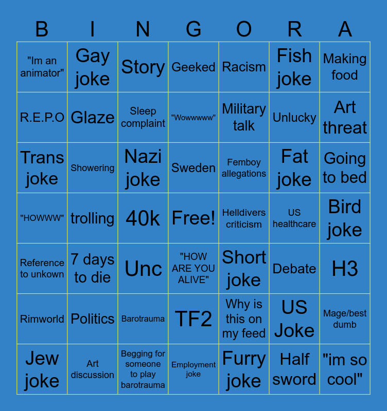 This bingo card has a free space and 48 words: Why is this on my feed, Unlucky, Employment joke, trolling, Nazi joke, Bird joke, Gay joke, Art discussion, Fish joke, "HOW ARE YOU ALIVE", Making food, Geeked, Fat joke, Femboy allegations, Rimworld, US healthcare, R.E.P.O, Art threat, US Joke, Racism, Military talk, 40k, "Im an animator", Glaze, Mage/best dumb, Sleep complaint, Going to bed, Jew joke, Sweden, Showering, Half sword, Helldivers criticism, H3, Politics, "HOWWW", Short joke, Debate, Trans joke, Unc, Barotrauma, Reference to unkown, "im so cool", Story, Begging for someone to play barotrauma, "Wowwwww", TF2, 7 days to die and Furry joke.