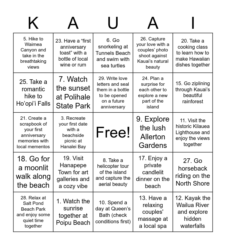 This bingo card has a free space and 30 words: 1. Watch the sunrise together at Poipu Beach, 2. Take a boat tour along the Napali Coast, 3. Recreate your first date with a beachside picnic at Hanalei Bay, 4. Have a romantic dinner at a beachfront restaurant like The Beach House, 5. Hike to Waimea Canyon and take in the breathtaking views, 6. Go snorkeling at Tunnels Beach and swim with sea turtles, 7. Watch the sunset at Polihale State Park, 8. Take a helicopter tour of the island and capture the aerial beauty, 9. Explore the lush Allerton Gardens, 10. Spend a day at Queen’s Bath (check conditions first), 11. Visit the historic Kilauea Lighthouse and enjoy the views together, 12. Kayak the Wailua River and explore hidden waterfalls, 13. Have a relaxing couples' massage at a local spa, 14. Take a romantic stroll along the Ke'e Beach coastline, 15. Go ziplining through Kauai’s beautiful rainforest, 16. Share a shave ice from a local stand (like JoJo’s Shave Ice), 17. Enjoy a private candlelit dinner on the beach, 18. Go for a moonlit walk along the beach, 19. Visit Hanapepe Town for art galleries and a cozy vibe, 20. Take a cooking class to learn how to make Hawaiian dishes together, 21. Create a scrapbook of your first anniversary memories with local mementos, 22. Paddleboard in Hanalei Bay at sunrise, 23. Have a “first anniversary toast” with a bottle of local wine or rum, 24. Plan a surprise for each other to explore a new part of the island, 25. Take a romantic hike to Ho’opi’i Falls, 26. Capture your love with a couples’ photo shoot against Kauai’s natural beauty, 27. Go horseback riding on the North Shore, 28. Relax at Salt Pond Beach Park and enjoy some quiet time together, 29. Write love letters and seal them in a bottle to be opened on a future anniversary and 30. End the trip with a stargazing session from Polihale Beach.
