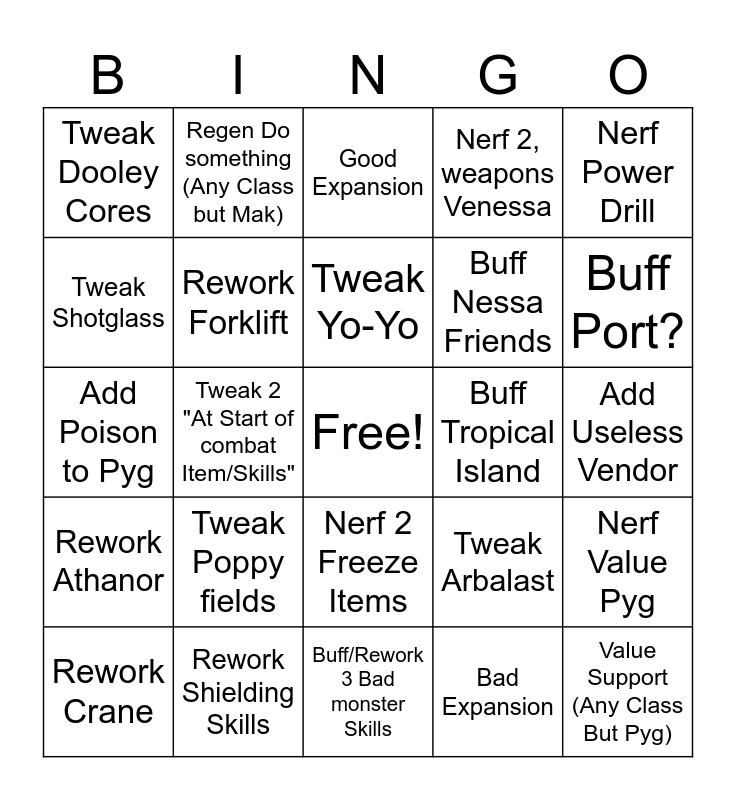 This bingo card has a free space and 24 words: Tweak Poppy fields, Rework Shielding Skills, Tweak Yo-Yo, Rework Crane, Nerf Power Drill, Tweak Dooley Cores, Tweak Shotglass, Regen Do something (Any Class but Mak), Buff Tropical Island, Nerf 2 Freeze Items, Buff Nessa Friends, Add Poison to Pyg, Tweak Arbalast, Nerf Value Pyg, Rework Forklift, Bad Expansion, Add Useless Vendor, Good Expansion, Buff Port?, Tweak 2 "At Start of combat Item/Skills", Value Support (Any Class But Pyg), Rework Athanor, Nerf 2, weapons Venessa and Buff/Rework 3 Bad monster Skills.