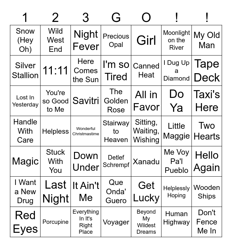 This bingo card has 70 words: Coming Up, Helpless, Pobrecito, Reviews (from here to zed), Sitting, Waiting, Wishing, St Patrick's Day, Tape Deck, Walk of Life, Wild West End, Wonderful Christmastime, The Golden Rose, A Face in the Crowd, Moonlight on the River, My Old Man, Wendy, You're so Good to Me, Here Comes the Sun, I'm so Tired, Beyond My Wildest Dreams, I Dug Up a Diamond, Taxi's Here, Lost In Yesterday, 11:11, Savitri, Voyager, Get Lucky, Helplessly Hoping, Wooden Ships, Handle With Care, Last Night, Night Fever, Love You Inside and Out, Four Strong Winds, Human Highway, Hello Again, Magic, Porcupine, Fox and Toad, Que Onda' Guero, Girl, Little Maggie, Two Hearts, Silver Stallion, Who Can It Be Now?, Down Under, Precious Opal, All in Favor, Me Voy Pa'l Pueblo, Cowboy, I Want a New Drug, Stuck With You, Towards the Sun, Detlef Schrempf, Xanadu, Do Ya, Can't Stop, Snow (Hey Oh), Hypnotized, Everything In It's Right Place, Stairway to Heaven, Canned Heat, Let's Stay Together, Don't Fence Me In, Red Eyes, Bright Sunny South, It Ain't Me, Peaceful Easy Feeling, I'm An Old Cowhand, That's Life and Right Place, Wrong Time.