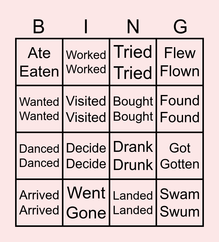 This bingo card has 22 words: Went Gone, Was Were Been, Worked Worked, Did Done, Visited Visited, Bought Bought, Ate Eaten, Tried Tried, Drank Drunk, Swam Swum, Danced Danced, Flew Flown, Drove Driven, Packed Packed, Landed Landed, Gave Given, Got Gotten, Arrived Arrived, Decide Decide, Wanted Wanted, Found Found and Looked Looked.