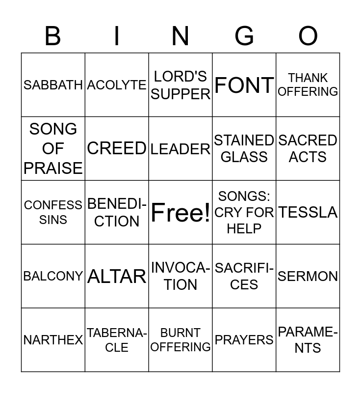 This bingo card has a free space and 24 words: ALTAR, TABERNA-CLE, LEADER, NARTHEX, THANK OFFERING, SABBATH, SONG OF PRAISE, ACOLYTE, SONGS: CRY FOR HELP, INVOCA-TION, STAINED GLASS, CONFESS SINS, SACRIFI-CES, SERMON, CREED, PRAYERS, TESSLA, LORD'S SUPPER, SACRED ACTS, BENEDI-CTION, PARAME-NTS, BALCONY, FONT and BURNT OFFERING.