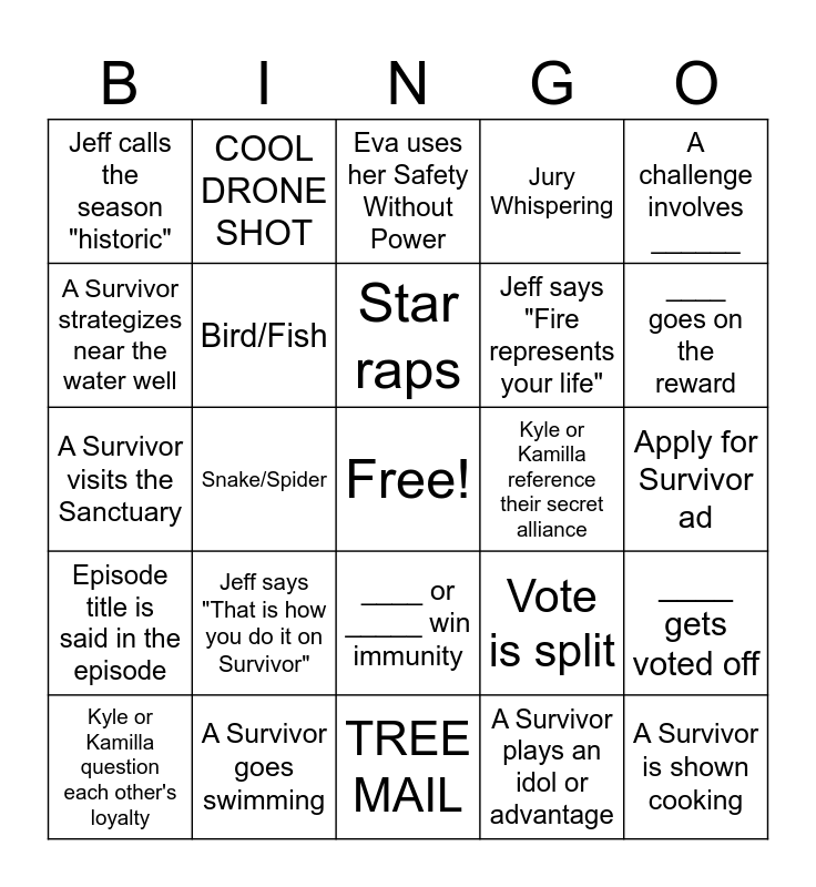 This bingo card has a free space and 24 words: Jeff says "That is how you do it on Survivor", A Survivor goes swimming, Star raps, Kyle or Kamilla question each other's loyalty, A challenge involves ______, Jeff calls the season "historic", A Survivor strategizes near the water well, COOL DRONE SHOT, Kyle or Kamilla reference their secret alliance, ____ or _____ win immunity, Jeff says "Fire represents your life", A Survivor visits the Sanctuary, Vote is split, ____ gets voted off, Bird/Fish, A Survivor plays an idol or advantage, Apply for Survivor ad, Eva uses her Safety Without Power, ____ goes on the reward, Snake/Spider, A Survivor is shown cooking, Episode title is said in the episode, Jury Whispering and TREE MAIL.