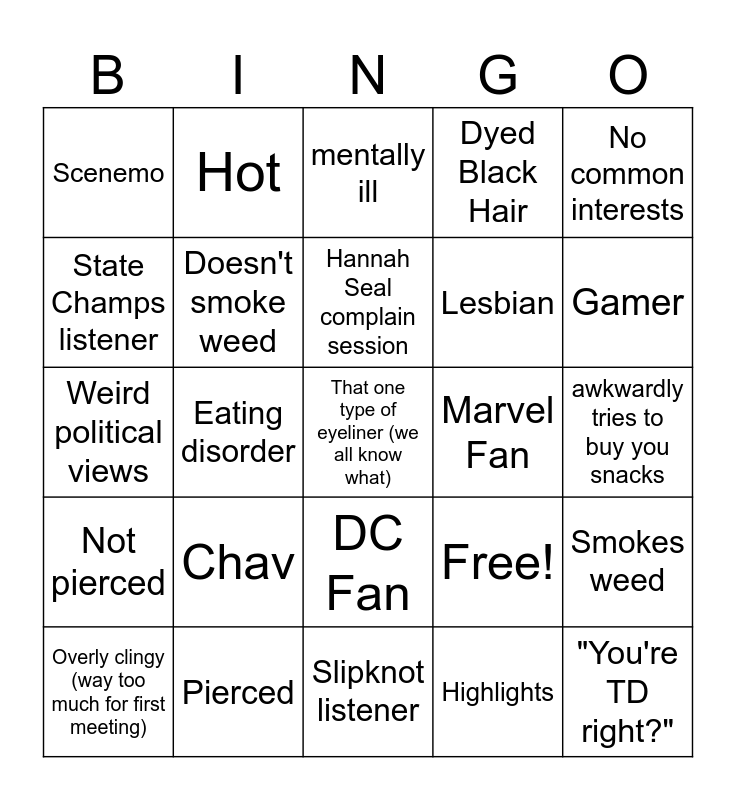 This bingo card has 25 words: Chav, Slipknot listener, Hannah Seal complain session, Overly clingy (way too much for first meeting), No common interests, Scenemo, State Champs listener, Hot, Marvel Fan, DC Fan, Lesbian, Weird political views, Free!, Smokes weed, Doesn't smoke weed, "You're TD right?", awkwardly tries to buy you snacks, mentally ill, Gamer, Eating disorder, That one type of eyeliner (we all know what), Pierced, Not pierced, Dyed Black Hair and Highlights.