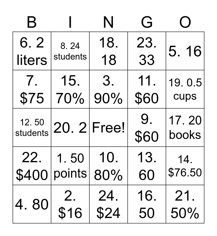 This bingo card has a free space and 24 words: 1. 50 points, 2. $16, 3. 90%, 4. 80, 5. 16, 6. 2 liters, 7. $75, 8. 24 students, 9. $60, 10. 80%, 11. $60, 12. 50 students, 13. 60, 14. $76.50, 15. 70%, 16. 50, 17. 20 books, 18. 18, 19. 0.5 cups, 20. 2, 21. 50%, 22. $400, 23. 33 and 24. $24.
