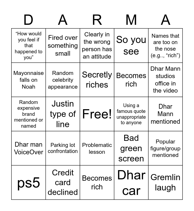 This bingo card has a free space and 34 words: Inappropriate Music, Dhar car, Flashback, What happens in the dark will always come to light, Dhar man VoiceOver, Random celebrity appearance, Names that are too on the nose (e.g.., “rich”), ps5, Fired over something small, Kids with iPad, Secretly riches, Clearly in the wrong person has an attitude, Time skip, Extreme coincidence, Using a famous quote unappropriate to anyone, Dhar Mann studios office in the video, Credit card declined, Random expensive brand mentioned or named, Parking lot confrontation, Bad green screen, Problematic lesson, Cartoon supervillain, “How would you feel if that happened to you”, Dhar Mann mentioned, Becomes rich, Gremlin laugh, So you see, Completely out of pocket line, Becomes rich, Mayonnaise falls on Noah, Spaghetti dinner, Justin type of line, Popular figure/group mentioned and Bully confrontation.
