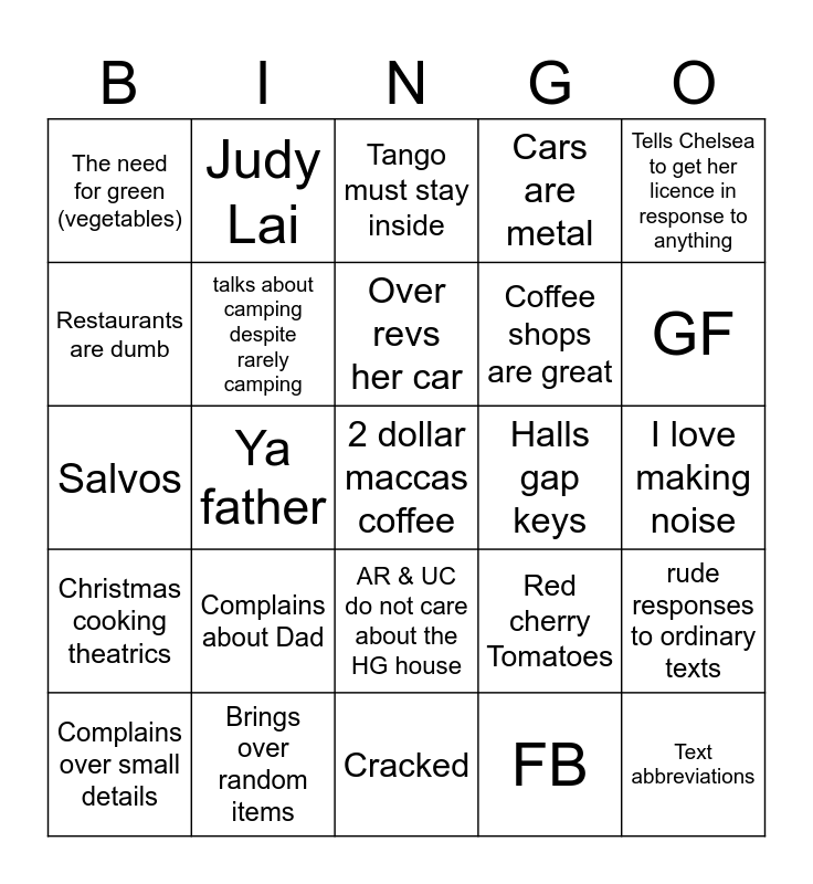 This bingo card has a free space and 24 words: Complains about Dad, Brings over random items, Over revs her car, Complains over small details, Tells Chelsea to get her licence in response to anything, The need for green (vegetables), Restaurants are dumb, Judy Lai, Halls gap keys, AR & UC do not care about the HG house, Coffee shops are great, Salvos, Red cherry Tomatoes, rude responses to ordinary texts, talks about camping despite rarely camping, FB, I love making noise, Tango must stay inside, GF, Ya father, Text abbreviations, Christmas cooking theatrics, Cars are metal and Cracked.