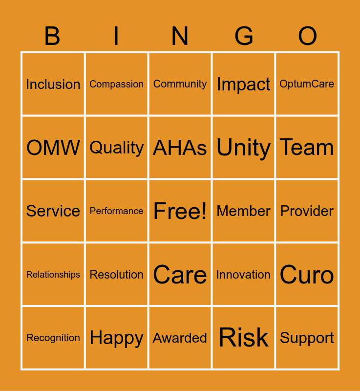 This bingo card has a free space and 39 words: Culture, Optum, Collaboration, Innovation, Curo, Relationships, Performance, Integrity, Member, Provider, OMW, Compassion, Difference, Team, Service, Resolution, Care, Impact, Colleague, Recognition, Quality, AHAs, Risk, OptumCare, United, Happy, Awarded, Values, Remote, Inclusion, Bravo, Communication, Unity, Support, We Care, Compliance, Community, Patient Experience and Appreciation.