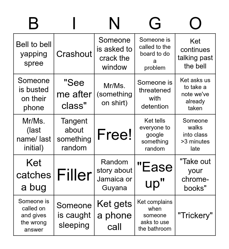 This bingo card has a free space and 24 words: Filler, Someone is caught sleeping, Mr/Ms. (something on shirt), Someone is called on and gives the wrong answer, Ket continues talking past the bell, Bell to bell yapping spree, Someone is busted on their phone, Crashout, Ket tells everyone to google something random, Random story about Jamaica or Guyana, Someone is threatened with detention, Mr/Ms. (last name/ last initial), "Ease up", "Take out your chrome- books", "See me after class", Ket complains when someone asks to use the bathroom, Someone walks into class >3 minutes late, Someone is asked to crack the window, Ket asks us to take a note we've already taken, Tangent about something random, "Trickery", Ket catches a bug, Someone is called to the board to do a problem and Ket gets a phone call.