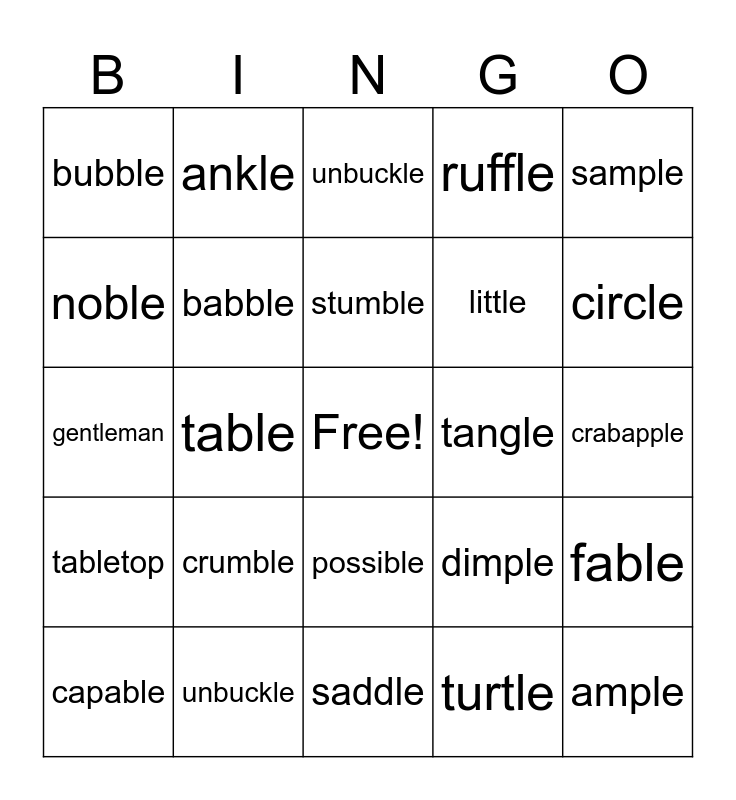 This bingo card has a free space and 49 words: single, ample, purple, saddle, crumble, puzzle, ankle, wobble, noble, castle, babble, ruffle, fable, dimple, cattle, grumble, stumble, tangle, table, sample, table, turtle, bubble, little, scribble, circle, capable, unable, possible, tabletop, paddleboat, unscramble, capable, sensible, unbuckle, unsettled, bicycle, crabbapple, crabapple, handlebars, unsinkable, terrible, bubblegum, candlelight, gentleman, unbuckle, unsaddle, bubblegum and tentacle.
