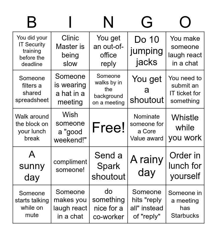 This bingo card has a free space and 44 words: Someone in a meeting has Tim Horton's, Someone in a meeting has Starbucks, A pet appears on screen in a meeting, Someone starts talking while on mute, Someone is eating while in a meeting, Someone hits "reply all" instead of "reply", You get an out-of-office reply, Someone sends a gif in a chat you're part of, You make someone laugh react in a chat, Someone makes you laugh react in a chat, Do 10 jumping jacks, Nominate someone for a Core Value award, Send a Spark shoutout, compliment someone!, Listen to music while you work, do something nice for a co-worker, Take a stretch break, Walk around the block on your lunch break, Share something fun in the Show & Tell chat, You need to submit an IT ticket for something, Clinic Master is being slow, You get an error message from any app, Learn something new!, You did your IT Security training before the deadline, Someone posts in the wrong chat, Whistle while you work, Have a great day!, You help someone or someone helps you, A rainy day, A sunny day, A cloudy day, Order in lunch for yourself, Dance break!, Get a fun beverage to sip on while you work, Wish someone a "good weekend!", Share a pet photo, Eat some fruit, Have a treat!, Someone walks by in the background on a meeting, Someone filters a shared spreadsheet, You get a shoutout, Someone is still in their pyjamas on a meeting, Someone is wearing a hat in a meeting and Someone sneezes or coughs in a meeting (mic on or off).