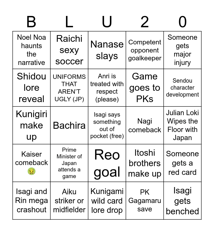 This bingo card has a free space and 24 words: Prime Minister of Japan attends a game, Aiku striker or midfielder, Anri is treated with respect (please), Isagi and Rin mega crashout, Someone gets major injury, Noel Noa haunts the narrative, Shidou lore reveal, Raichi sexy soccer, Nagi comeback, Reo goal, Game goes to PKs, Kunigiri make up, Itoshi brothers make up, Someone gets a red card, UNIFORMS THAT AREN’T UGLY (JP), PK Gagamaru save, Julian Loki Wipes the Floor with Japan, Nanase slays, Sendou character development, Bachira, Isagi gets benched, Kaiser comeback 🤢, Competent opponent goalkeeper and Kunigami wild card lore drop.
