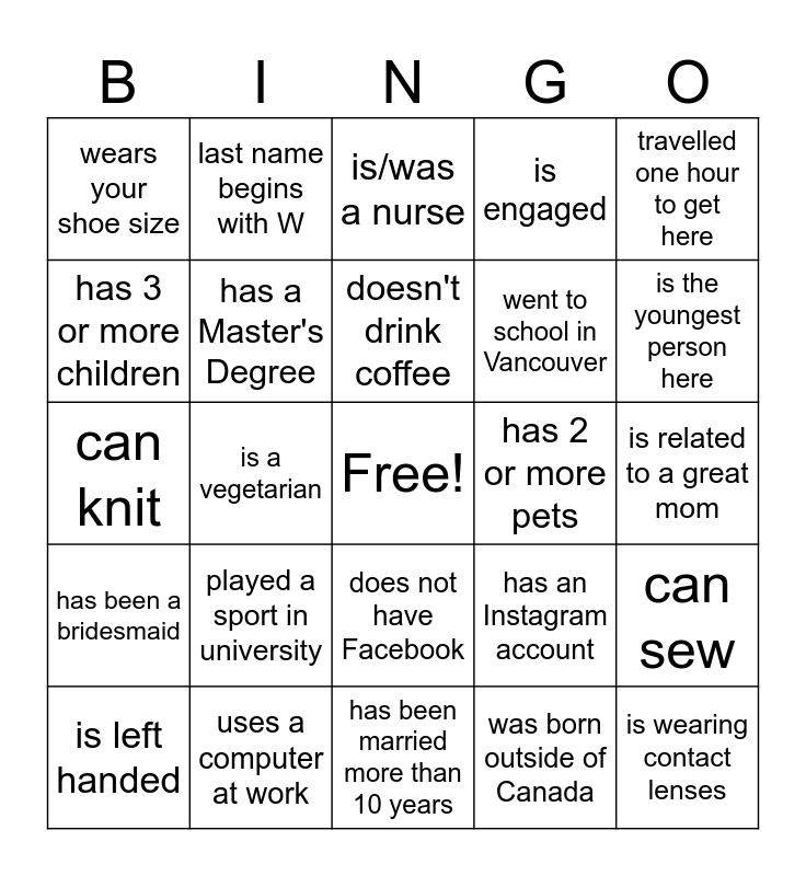 This bingo card has a free space and 39 words: plays a musical instrument, is wearing black, can change a tire, has a Master's Degree, is left handed, does not have Facebook, doesn't drink coffee, knows 3 languages, travelled one hour to get here, has been a bridesmaid, is a vegetarian, is engaged, is wearing contact lenses, is related to a great mom, has 2 or more pets, played a sport in university, has met someone famous, wears your shoe size, is the same age as you, has an Instagram account, has 3 or more children, has been married more than 10 years, went to school in Vancouver, is the youngest person here, travelled out of the country in the last month, baked something in the last week, has skydived, has bungee jumped, is the oldest person here, last name begins with W, has a child whose name begins with M, is/was a teacher, is/was a nurse, uses a computer at work, was born outside of Canada, drives/drove a minivan, can sew, can knit and can crochet.