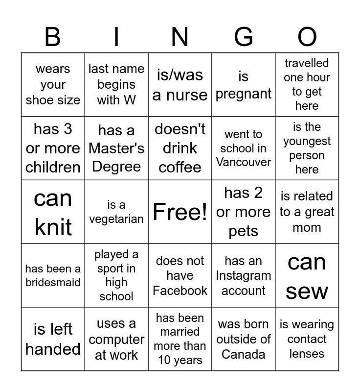 This bingo card has a free space and 39 words: plays a musical instrument, is wearing black, can change a tire, has a Master's Degree, is left handed, does not have Facebook, doesn't drink coffee, knows 3 languages, travelled one hour to get here, has been a bridesmaid, is a vegetarian, is pregnant, is wearing contact lenses, is related to a great mom, has 2 or more pets, played a sport in high school, has met someone famous, wears your shoe size, is the same age as you, has an Instagram account, has 3 or more children, has been married more than 10 years, went to school in Vancouver, is the youngest person here, travelled out of the country in the last month, baked something in the last week, has skydived, has bungee jumped, is the oldest person here, last name begins with W, has a child whose name begins with M, is/was a teacher, is/was a nurse, uses a computer at work, was born outside of Canada, drives/drove a minivan, can sew, can knit and can crochet.