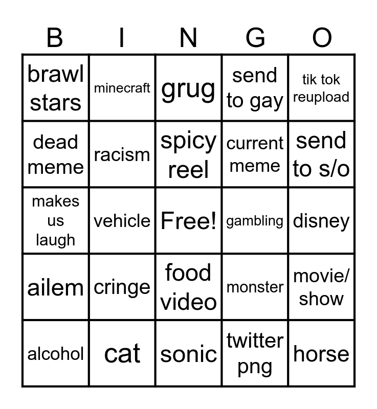 This bingo card has a free space and 24 words: cringe, cat, spicy reel, alcohol, tik tok reupload, brawl stars, dead meme, minecraft, gambling, food video, current meme, makes us laugh, monster, movie/ show, racism, twitter png, disney, grug, send to s/o, vehicle, horse, ailem, send to gay and sonic.