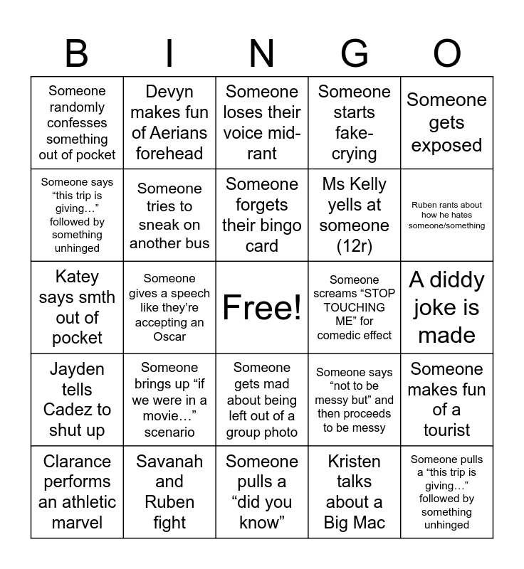 This bingo card has a free space and 25 words: Someone brings up “if we were in a movie…” scenario, Someone pulls a “did you know”, Someone forgets their bingo card, Clarance performs an athletic marvel, Someone gets exposed, Someone randomly confesses something out of pocket, Someone says “this trip is giving…” followed by something unhinged, Devyn makes fun of Aerians forehead, Someone screams “STOP TOUCHING ME” for comedic effect, Someone gets mad about being left out of a group photo, Ms Kelly yells at someone (12r), Katey says smth out of pocket, Someone says “not to be messy but” and then proceeds to be messy, Someone makes fun of a tourist, Someone tries to sneak on another bus, Someone brings contraband, A diddy joke is made, Someone loses their voice mid-rant, Ruben rants about how he hates someone/something, Someone gives a speech like they’re accepting an Oscar, Someone pulls a “this trip is giving…” followed by something unhinged, Savanah and Ruben fight, Jayden tells Cadez to shut up, Someone starts fake-crying and Kristen talks about a Big Mac.