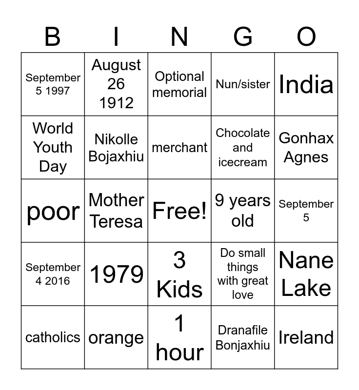 This bingo card has a free space and 24 words: 1979, orange, merchant, catholics, India, September 5 1997, World Youth Day, August 26 1912, 9 years old, 3 Kids, Chocolate and icecream, poor, Do small things with great love, Nane Lake, Nikolle Bojaxhiu, Dranafile Bonjaxhiu, September 5, Optional memorial, Gonhax Agnes, Mother Teresa, Ireland, September 4 2016, Nun/sister and 1 hour.