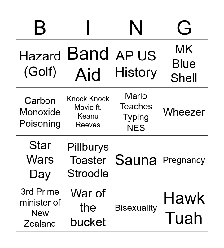 This bingo card has 16 words: War of the bucket, Pregnancy, AP US History, Hazard (Golf), Star Wars Day, Band Aid, Sauna, Bisexuality, Carbon Monoxide Poisoning, Knock Knock Movie ft. Keanu Reeves, 3rd Prime minister of New Zealand, MK Blue Shell, Pillburys Toaster Stroodle, Wheezer, Mario Teaches Typing NES and Hawk Tuah.