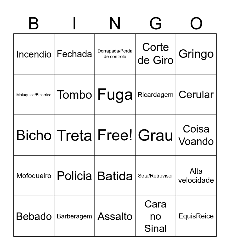 This bingo card has a free space and 25 words: Policia, Assalto, Fuga, Bebado, Gringo, Incendio, Maluquice/Bizarrice, Fechada, Grau, Batida, Ricardagem, Bicho, Seta/Retrovisor, Alta velocidade, Tombo, Boa Ação, Coisa Voando, Derrapada/Perda de controle, Cerular, Treta, EquisReice, Barberagem, Mofoqueiro, Corte de Giro and Cara no Sinal.