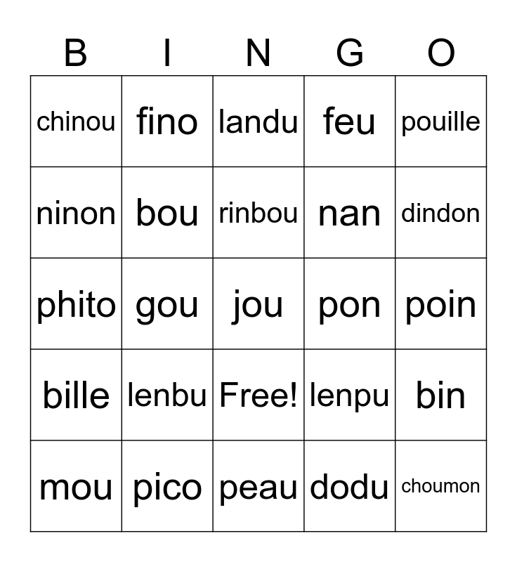 This bingo card has 26 words: Free!, mou, bou, pin, feu, pouille, ninon, fino, rinbou, dodu, dindon, phito, pico, peau, pon, choumon, chinou, lenbu, landu, lenpu, poin, bille, gou, jou, nan and bin.