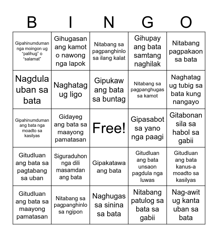 This bingo card has a free space and 24 words: Siguraduhon nga dili masamdan ang bata, Nitabang sa pagpanghinlo sa ngipon, Gipukaw ang bata sa buntag, Gitudluan ang bata sa maayong pamatasan, Nitabang pagpakaon sa bata, Gipahinumduman nga moingon ug “palihug” o “salamat”, Nagdula uban sa bata, Gihugasan ang kamot o nawong nga lapok, Gipasabot sa yano nga paagi, Gipakatawa ang bata, Nitabang sa pagpanghugas sa kamot, Gipahinumduman ang bata nga moadto sa kasilyas, Gitudluan ang bata unsaon pagdula nga luwas, Gitudluan ang bata kanus-a moadto sa kasilyas, Naghatag ug ligo, Nitabang patulog sa bata sa gabii, Gitabonan sila sa habol sa gabii, Nitabang sa pagpanghinlo sa ilang kalat, Naghatag ug tubig sa bata kung nangayo, Gidayeg ang bata sa maayong pamatasan, Nag-awit ug kanta uban sa bata, Gitudluan ang bata sa pagtabang sa uban, Gihupay ang bata samtang naghilak and Naghugas sa sinina sa bata.