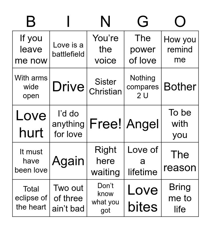 This bingo card has a free space and 97 words: I don’t want to miss a thing, November Rain, I want to know what love is, I’d do anything for love, With or without you, Everything I do, I do it for you, Keep on loving you, Nothing else matters, All by myself, Broken wings, When it’s love, These dreams, Is this love, It must have been love, Don’t speak, If you leave me now, How you remind me, More than words, Open arms, Every rose has its thorn, Wind of change, In the air tonight, Black velvet, Home sweet home, Beautiful, Sister Christian, Total eclipse of the heart, The reason, Kayleigh, Angels, Drive, The power of love, Always, Eternal flame, Don’t know what you got, Right here waiting, Here without you, I just died in you arms, Without you, Love hurt, Never tear us apart, To be with you, If I could turn back time, Love bites, Again, All out of love, Hero, Up where we belong, Walking in Memphis, High enough, One moment in time, Somebody to love, What’s up?, Incomplete, Purple rain, Poison, Sometimes she cries, Love is a battlefield, Feel like makin’ love, We don’t need another hero, Silent lucidity, Missing you, Love walked in, Nothing’s gonna stop us now, Under the bridge, Iris, Miles away, Outside, Waiting for a girl like you, Two out of three ain’t bad, Nothing compares 2 U, Can’t fight this feeling, Big love, If you’re not the one, Love walks in, Fall to pieces, I’ll never let you go, Against all odds, Angel, When love & hate collide, Faithfully, Bother, Changes, Don’t forget me, 18 and life, Dust in the wind, Bring me to life, House of pain, Don’t cry, A world without heroes, You’re the voice, More than words can say, Hero, Love of a lifetime, With arms wide open, Lisa and The flame.