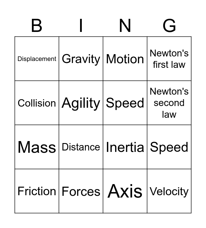 This bingo card has 16 words: Forces, Speed, Motion, Displacement, Mass, Gravity, Inertia, Axis, Collision, Agility, Friction, Newton's first law, Distance, Newton's second law, Speed and Velocity.