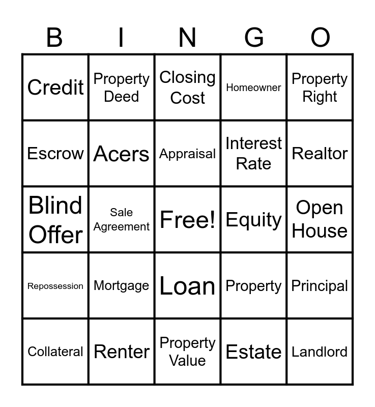 This bingo card has a free space and 24 words: Mortgage, Renter, Appraisal, Collateral, Property Right, Credit, Escrow, Property Deed, Equity, Loan, Interest Rate, Blind Offer, Property, Principal, Acers, Estate, Open House, Closing Cost, Realtor, Sale Agreement, Landlord, Repossession, Homeowner and Property Value.