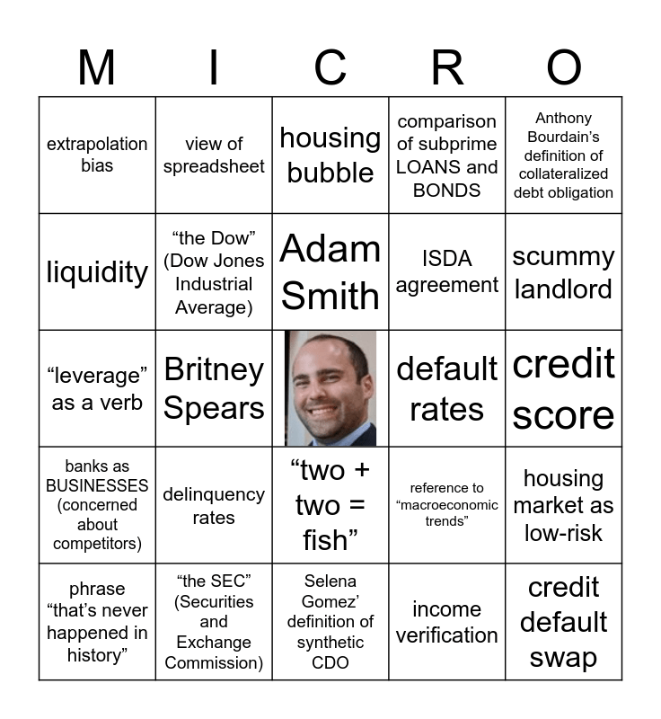 This bingo card has a free space and 40 words: “hedge” as a verb, “leverage” as a verb, “short” as a verb, “the Dow” (Dow Jones Industrial Average), “the SEC” (Securities and Exchange Commission), “two + two = fish”, Adam Smith, Alan Greenspan, Anthony Bourdain’s definition of collateralized debt obligation, banks as BUSINESSES (concerned about competitors), Britney Spears, comparison of subprime LOANS and BONDS, credit default swap, credit score, default rates, delinquency rates, explanation of tranches (AAA to B), extrapolation bias, Fannie Mae, housing bubble, housing market as low-risk, income verification, ISDA agreement, liquidity, Ludacris, Margot Robbie’s definition of subprime, Monsanto, mortgage backed security, mortgage defaults, Osama Bin Laden, overdraft penalties, phrase “that’s never happened in history”, prospectus, reference to “macroeconomic trends”, scummy landlord, Selena Gomez’ definition of synthetic CDO, studying the talmud at yeshiva, unemployment, view of spreadsheet and visit to foreclosed house.