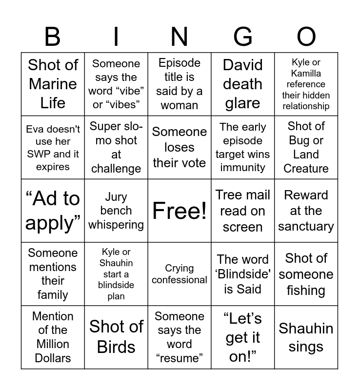 This bingo card has a free space and 38 words: The game on the journey is chance-based, Challenge ends in a puzzle, Mary calls herself an Underdog (Or equivalent), Super slo-mo shot at challenge, Shot of someone fishing, Kyle or Shauhin start a blindside plan, Someone loses their vote, Horrendous analogy, Kyle or Kamilla reference their hidden relationship, The early episode target wins immunity, Jury bench whispering, David death glare, Shauhin sings, Reward at the sanctuary, Eva doesn't use her SWP and it expires, Someone mentions their family, Episode title said by a man, Episode title is said by a woman, Pop up ad for a CBS show, Tree mail read on screen, Shot of Marine Life, Shot of Birds, Shot of Bug or Land Creature, Mention of the Million Dollars, Mention of “Survivor Bucket List”, Someone says the word “resume”, Strategy Talk at the Water Well, Heavy Rain Storm, “Dig Deep!”, “That’s how you / we do it on Survivor!”, Sassy Jeff, Crying confessional, “Let’s get it on!”, Someone says the word “vibe” or “vibes”, Someone loses their vote, The word ‘Blindside' is Said, “Ad to apply” and “At the end of the day…”.