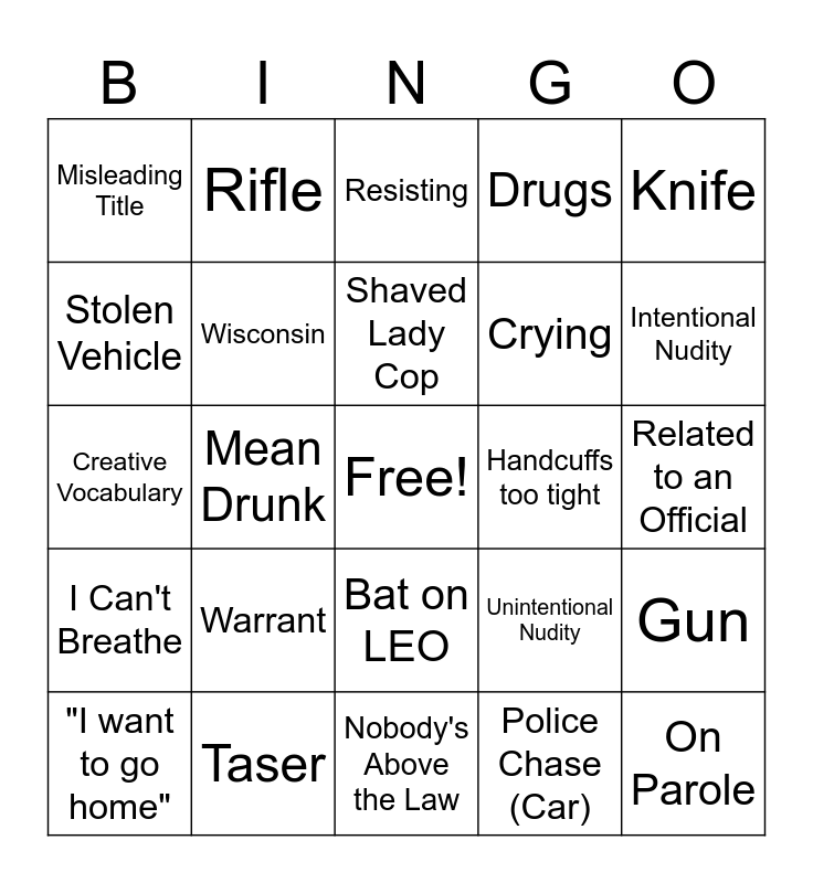 This bingo card has a free space and 69 words: I'm Pregnant!, Related to an Official, Calling for Relative, I have kids!, Taser, Sizing up officer, Drugs, Vomit, Knife, Decentralized, Gun, "You can't park there", Misleading Title, Resisting, Obstructing, Mean Drunk, Bat on LEO, Crying, High Functioning Drunk, I Can't Breathe, Handcuffs too tight, Unintentional Nudity, Intentional Nudity, "That's not mine", "I didn't do it", McDonalds, Trespassing, Knocked Out, Police Chase (Car), Foot Chase, Rifle, Patient Cop, Personal Phone Call, Personal Radio, Singing, GPS, 10-4, "Speak to your Sergeant", Stolen Vehicle, Suspended License, Warrant, On Parole, Spitting, Pee on Self, Bail Money, "I want to go home", Cop Mustache, Pepper Spray, 2/+ handcuffs, Wisconsin, Shaved Lady Cop, My Lawyer!, Whole Family Shows Up, Nobody's Above the Law, Explained Over and Over, We got you on camera, Cop Lecture, Escalating, Officer John in different location, Creative Vocabulary, Someone Gets Hit, Calling 911, Biting, Bad Censoring, Officer Sigh, "You're Hurting Me", Failed Taser, Mental Case and Dropped Bodycam.