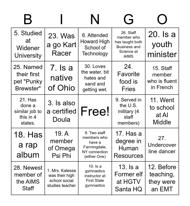 This bingo card has a free space and 30 words: 1. Mrs. Kalesse was their high school social studies teacher, 2. Has only missed two days of school since they started their career in education, 3. Is also a certified Doula, 4. Member of Kappa Alpha Psi Fraternity, 5. Studied at Widener University, 6. Attended Howard High School of Technology, 7. Is a native of Ohio, 8. Two staff members who have a Farmingdale, NY connection (either One), 9. Served in the U.S. military (4 staff members), 10. Is a gymnastics instructor at First State gymnastics, 11. Went to school at AI Middle, 12. Before teaching, they were an EMT, 13. Is a Former elf at HGTV Santa HQ, 14. Former jobs include church pianist and Sonic car hop waitress, 15. Staff member who is fluent in French, 16. High school drum major, 17. Has a degree in Human Resources, 18. Has a rap album, 19. A member of Omega Psi Phi, 20. Is a youth minister, 21. Has done a similar job to this in 4 states., 22. Ran Track for Univ. of Delaware, 23. Was a go Kart Racer, 24. Favorite food is Fries, 25. Named their first pet "Punky Brewster", 26. Staff member who has taught both Business and Science at AIMS, 27. Undercover line dancer, 28. Newest member of the AIMS Staff, 30. Loves the water, bit hates and sand and getting wet. and 31. Sang with Debbie Gibson for a Mattel Toys Commerical.