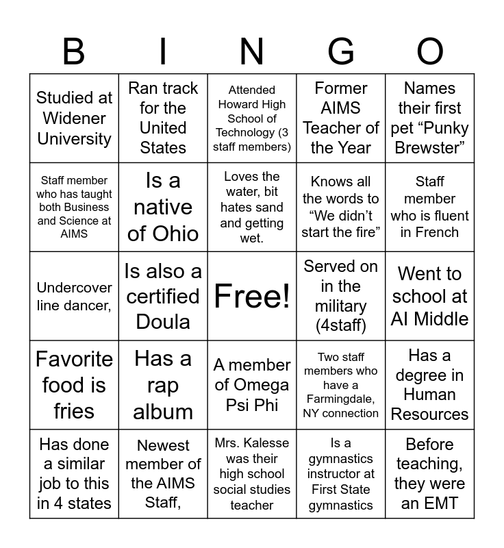 This bingo card has a free space and 31 words: Mrs. Kalesse was their high school social studies teacher, Has only missed two days of school since they started their career in education, Is also a certified Doula, Member of Kappa Alpha Psi Fraternity, Studied at Widener University, Attended Howard High School of Technology (3 staff members), Is a native of Ohio, Two staff members who have a Farmingdale, NY connection, Served on in the military (4staff), Is a gymnastics instructor at First State gymnastics, Went to school at AI Middle, Before teaching, they were an EMT, Is a Former elf at HGTV Santa HQ, Former jobs include church pianist and Sonic car hop waitress, Staff member who is fluent in French, High school drum major, Has a degree in Human Resources, Has a rap album, Favorite food is fries, A member of Omega Psi Phi, Names their first pet “Punky Brewster”, Is a youth minister, Has done a similar job to this in 4 states, Ran track for the United States, Knows all the words to “We didn’t start the fire”, Staff member who has taught both Business and Science at AIMS, Former AIMS Teacher of the Year, Undercover line dancer,, Newest member of the AIMS Staff,, Loves the water, bit hates sand and getting wet. and Sang with Debbie Gibson for a Mattel Toys Commercial..