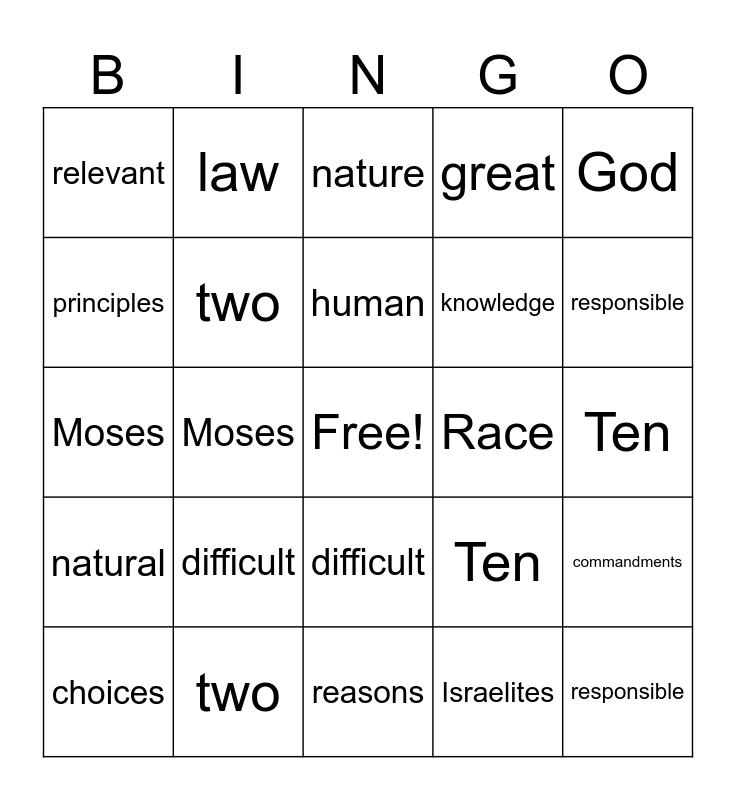 ⚠ This card has duplicate items: freedom (2), responsible (2), choices (2), reasons (2), difficult (2), natural (2), law (2), moral (2), principles (2), strive (2), two (2), great (2), commandments (2), Ten (2), Adam (2), Eve (2), human (2), Race (2), nature (2), God (2), Moses (2), Israelites (2), relevant (2), knowledge (2)