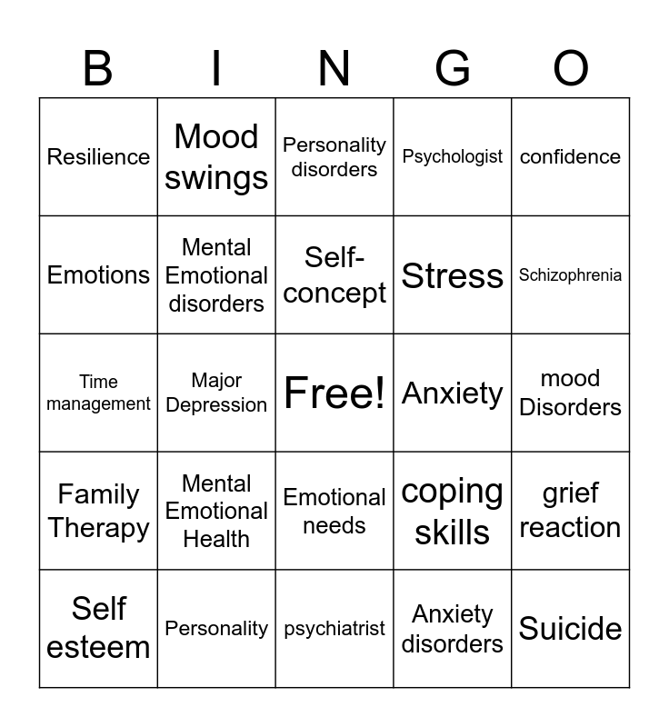 This bingo card has a free space and 24 words: Mental Emotional Health, Personality, Self-concept, Self esteem, confidence, Resilience, Emotions, Mood swings, Anxiety, Emotional needs, Stress, Time management, coping skills, grief reaction, Mental Emotional disorders, Anxiety disorders, mood Disorders, Personality disorders, Schizophrenia, Major Depression, Suicide, Family Therapy, Psychologist and psychiatrist.