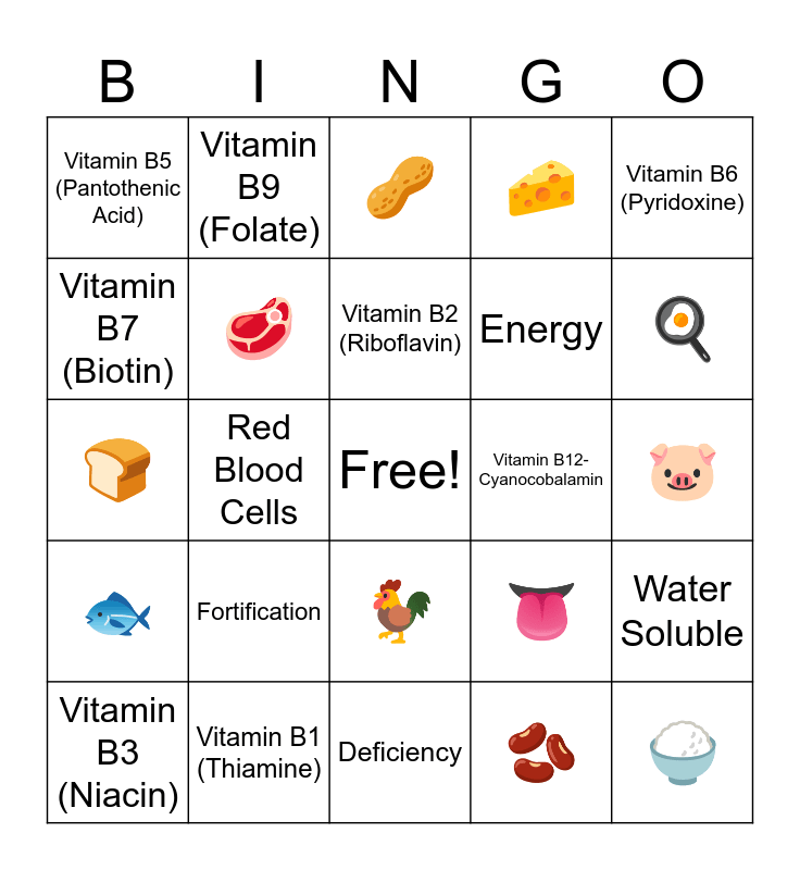 This bingo card has a free space and 24 words: Fortification, Vitamin B1 (Thiamine), Vitamin B2 (Riboflavin), Vitamin B3 (Niacin), Vitamin B6 (Pyridoxine), Vitamin B5 (Pantothenic Acid), Vitamin B7 (Biotin), Vitamin B9 (Folate), Vitamin B12-Cyanocobalamin, 🐓, Energy, 🍞, 👅, Water Soluble, 🥩, 🫘, 🐷, 🥜, 🍳, Red Blood Cells, 🍚, 🐟, 🧀 and Deficiency.