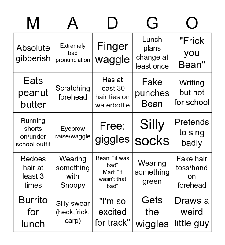 This bingo card has a free space and 24 words: Wearing something with Snoopy, Silly swear (heck,frick, carp), Has at least 30 hair ties on waterbottle, Burrito for lunch, "Frick you Bean", Absolute gibberish, Eats peanut butter, Extremely bad pronunciation, Silly socks, Bean: "it was bad" Mad: "it wasn't that bad", Fake punches Bean, Running shorts on/under school outfit, Wearing something green, Fake hair toss/hand on forehead, Scratching forehead, Gets the wiggles, Pretends to sing badly, Finger waggle, Writing but not for school, Eyebrow raise/waggle, Draws a weird little guy, Redoes hair at least 3 times, Lunch plans change at least once and "I'm so excited for track".