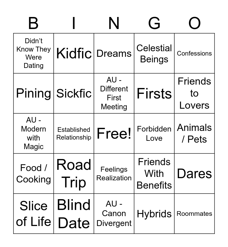 This bingo card has a free space and 70 words: Angst, Animals / Pets, Arranged Marriage, Based on Other Media, Blind Date, Canon Compliant, Celestial Beings, Chan POV, Confessions, Coworkers, Dares, Domesticity, Didn’t Know They Were Dating, Dreams, Enemies / Rivals to Lovers, Established Relationship, Feelings Realization, Firsts, Fluff, Food / Cooking, Forbidden Love, Friends With Benefits, Friends to Lovers, Gender Changes, Ghosts / Paranormal, Handholding, Happy Ending, Hurt / Comfort, Hybrids, Idiots in Love, Kidfic, Magic, Marriage of Convenience, Minho POV, Mutual Pining, Neighbors, Omegaverse Elements, One Night Stands, Partners in Crime, Pining, Rivals with Benefits, Road Trip, Roommates, Secret Admirer, Sharing a Bed, Sickfic, Slice of Life, Soulmates, Strangers to Lovers, Supernatural Elements, Time (Travel, Loops, etc.), Trapped Together, AU - Bodyguard, AU - Boxing, AU - Canon Divergent, AU - College / University, AU - Different First Meeting, AU - Fantasy, AU - Inspired by SKZ MV, AU - Modern, AU - Modern with Magic, AU - Non-Idol Celebrity, AU - Office, AU - Rock Band, AU - Royalty, AU - Shops (Coffee / Bakery / Flower / Tattoo, etc.), AU - Spies / Secret Agents, AU - Teachers, AU - Vampires and AU - Werewolves.
