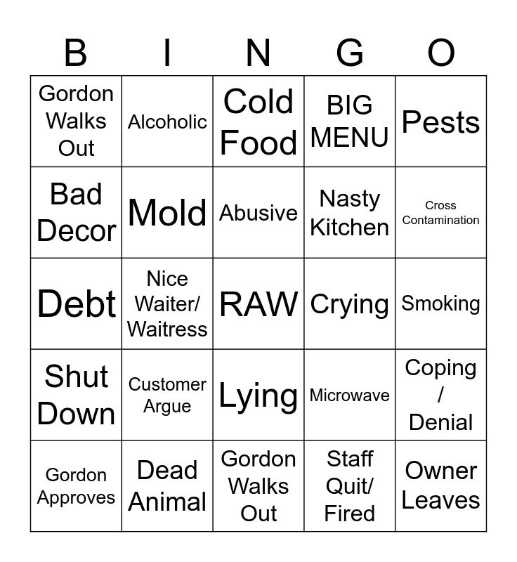 This bingo card has a free space and 24 words: Customer Argue, Dead Animal, Abusive, Gordon Approves, Pests, Gordon Walks Out, Bad Decor, Alcoholic, Crying, Lying, Nasty Kitchen, Debt, Microwave, Coping / Denial, Mold, Staff Quit/ Fired, Smoking, Cold Food, Cross Contamination, Nice Waiter/ Waitress, Owner Leaves, Shut Down, BIG MENU and Gordon Walks Out.