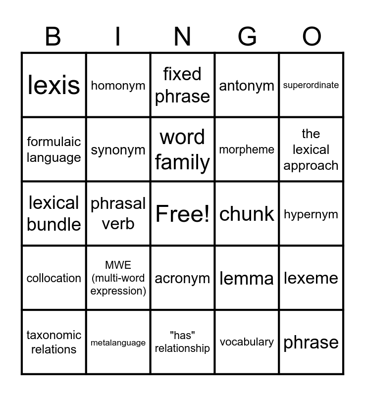 This bingo card has a free space and 24 words: MWE (multi-word expression), metalanguage, word family, taxonomic relations, superordinate, lexis, formulaic language, homonym, chunk, acronym, morpheme, lexical bundle, lemma, lexeme, synonym, vocabulary, hypernym, fixed phrase, the lexical approach, phrasal verb, phrase, collocation, antonym and "has" relationship.