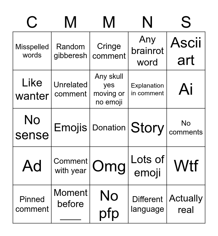 This bingo card has a free space and 24 words: Comment with year, Moment before ____, Any skull yes moving or no emoji, Pinned comment, Ascii art, Misspelled words, Like wanter, Random gibberesh, Story, Omg, Explanation in comment, No sense, Lots of emoji, Wtf, Unrelated comment, Different language, No comments, Cringe comment, Ai, Emojis, Actually real, Ad, Any brainrot word and No pfp.
