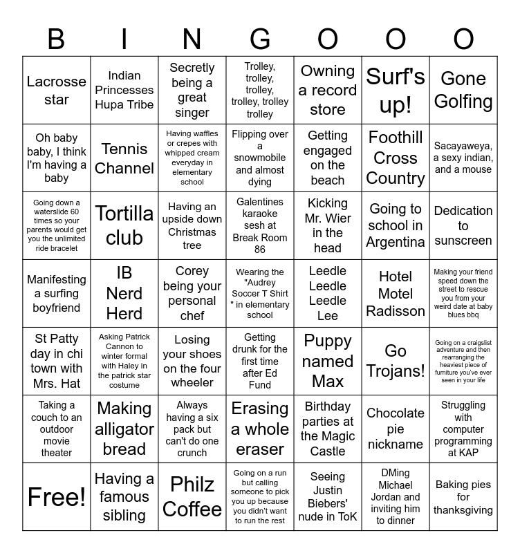 This bingo card has 51 words: Free!, Foothill Cross Country, Baking pies for thanksgiving, IB Nerd Herd, Having an upside down Christmas tree, Puppy named Max, Indian Princesses Hupa Tribe, Seeing Justin Biebers' nude in ToK, Surf's up!, Go Trojans!, Gone Golfing, Trolley, trolley, trolley, trolley, trolley trolley, Going to school in Argentina, Kicking Mr. Wier in the head, Erasing a whole eraser, St Patty day in chi town with Mrs. Hat, Oh baby baby, I think I'm having a baby, Sacayaweya, a sexy indian, and a mouse, Having a famous sibling, Owning a record store, Getting engaged on the beach, Corey being your personal chef, Lacrosse star, Tennis Channel, Philz Coffee, Wearing the "Audrey Soccer T Shirt " in elementary school, Having waffles or crepes with whipped cream everyday in elementary school, Going on a run but calling someone to pick you up because you didn’t want to run the rest, Dedication to sunscreen, Secretly being a great singer, Sleeping until 3pm like it's no problem, Asking Patrick Cannon to winter formal with Haley in the patrick star costume, Always having a six pack but can't do one crunch, Birthday parties at the Magic Castle, Getting drunk for the first time after Ed Fund, Manifesting a surfing boyfriend, Hotel Motel Radisson, Going on a craigslist adventure and then rearranging the heaviest piece of furniture you’ve ever seen in your life, Taking a couch to an outdoor movie theater, Making alligator bread, Going down a waterslide 60 times so your parents would get you the unlimited ride bracelet, Tortilla club, Chocolate pie nickname, DMing Michael Jordan and inviting him to dinner, Leedle Leedle Leedle Lee, Making your friend speed down the street to rescue you from your weird date at baby blues bbq, Flipping over a snowmobile and almost dying, Losing your shoes on the four wheeler, Struggling with computer programming at KAP, Galentines karaoke sesh at Break Room 86 and Getting stopped by Mexican Federales but they see your trunk filled with board games and let you go.