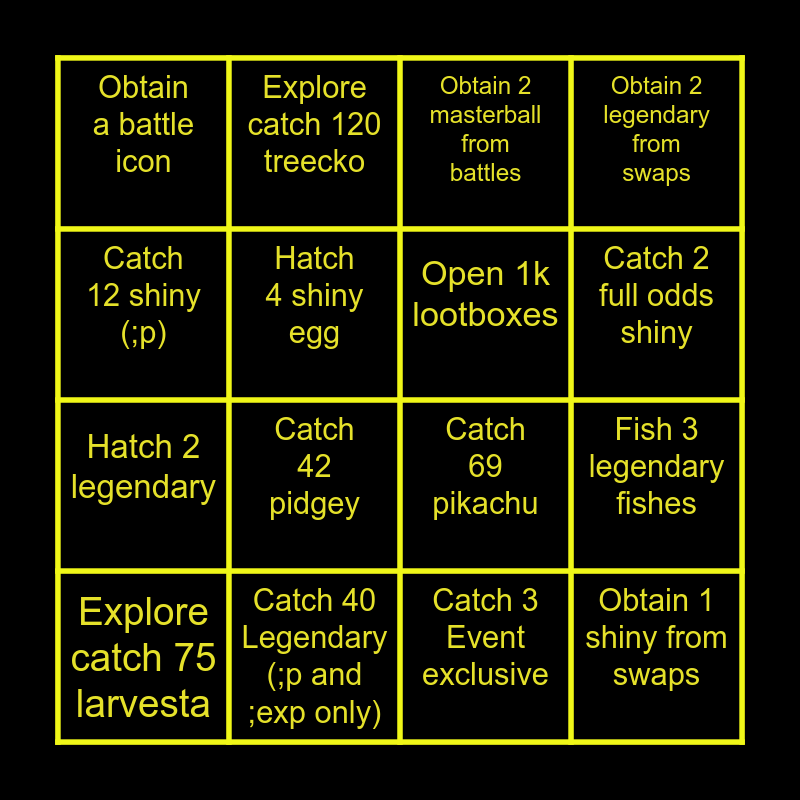 This bingo card has 16 words: Catch 40 Legendary (;p and ;exp only), Fish 3 legendary fishes, Obtain 2 masterball from battles, Obtain a battle icon, Hatch 2 legendary, Explore catch 120 treecko, Catch 69 pikachu, Catch 3 Event exclusive, Catch 12 shiny (;p), Hatch 4 shiny egg, Explore catch 75 larvesta, Obtain 2 legendary from swaps, Catch 42 pidgey, Catch 2 full odds shiny, Open 1k lootboxes and Obtain 1 shiny from swaps.