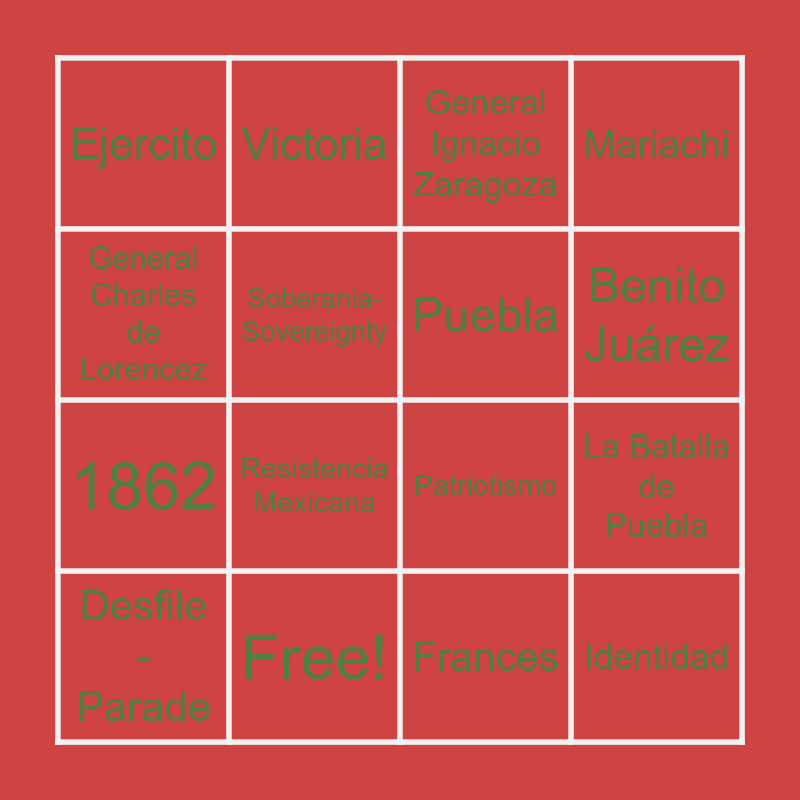 This bingo card has 16 words: Free!, La Batalla de Puebla, General Ignacio Zaragoza, Ejercito, 1862, Victoria, Patriotismo, Frances, General Charles de Lorencez, Soberania- Sovereignty, Desfile - Parade, Mariachi, Resistencia Mexicana, Benito Juárez, Puebla and Identidad.
