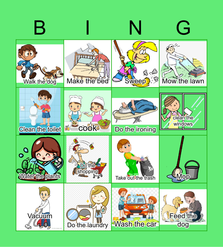 This bingo card has 20 images and 20 words: Mop, Wash the dishes, Sweep, Tidy up, Vacuum, Clean the toilet, Do the laundry, Walk the dog, Water the plants, Make the bed, Do the shopping, Take out the trash, cook, Feed the dog, Do the ironing, Set the table, clean the windows, Mow the lawn, Wash the car and dust the furniture.