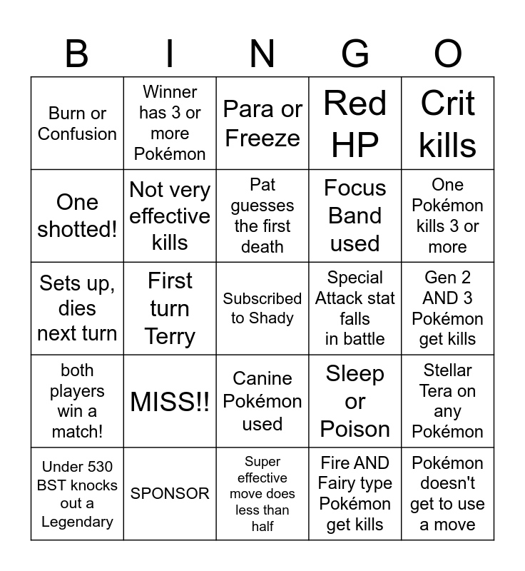 This bingo card has a free space and 24 words: MISS!!, SPONSOR, Pat guesses the first death, Under 530 BST knocks out a Legendary, Crit kills, Burn or Confusion, One shotted!, Winner has 3 or more Pokémon, Special Attack stat falls in battle, Canine Pokémon used, Focus Band used, Sets up, dies next turn, Sleep or Poison, Stellar Tera on any Pokémon, Not very effective kills, Fire AND Fairy type Pokémon get kills, Gen 2 AND 3 Pokémon get kills, Para or Freeze, One Pokémon kills 3 or more, First turn Terry, Pokémon doesn't get to use a move, both players win a match!, Red HP and Super effective move does less than half.