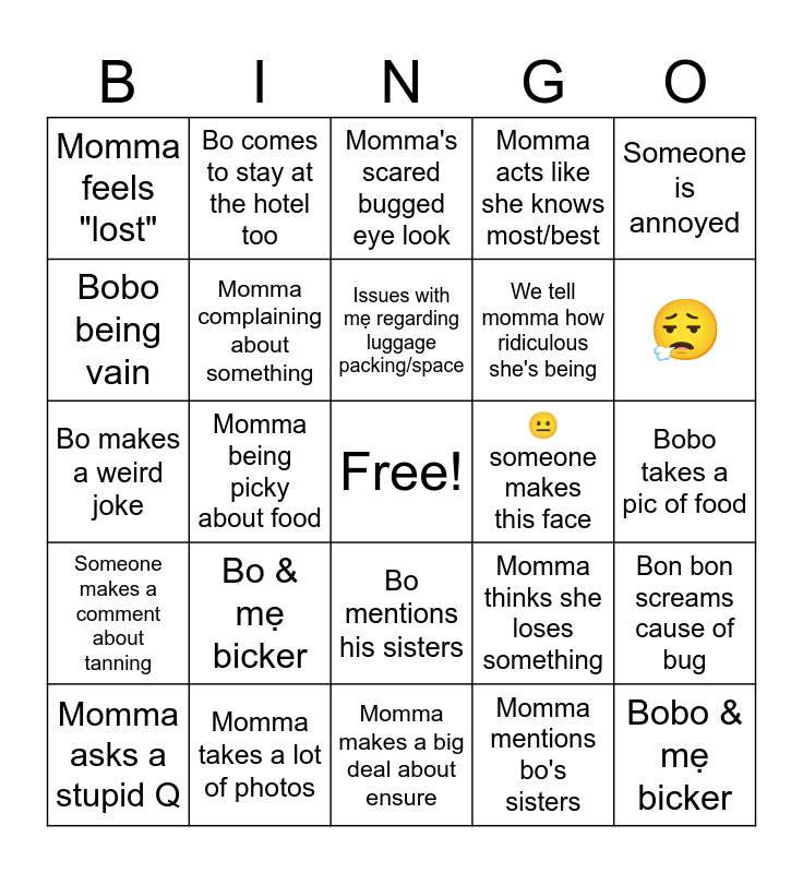 This bingo card has a free space and 24 words: Bo & mẹ bicker, Momma takes a lot of photos, Issues with mẹ regarding luggage packing/space, Momma asks a stupid Q, Someone is annoyed, Momma feels "lost", Bobo being vain, Bo comes to stay at the hotel too, 😐 someone makes this face, Bo mentions his sisters, We tell momma how ridiculous she's being, Bo makes a weird joke, Momma thinks she loses something, Bon bon screams cause of bug, Momma complaining about something, Momma mentions bo's sisters, Bobo takes a pic of food, Momma's scared bugged eye look, 😮💨, Momma being picky about food, Bobo & mẹ bicker, Someone makes a comment about tanning, Momma acts like she knows most/best and Momma makes a big deal about ensure.