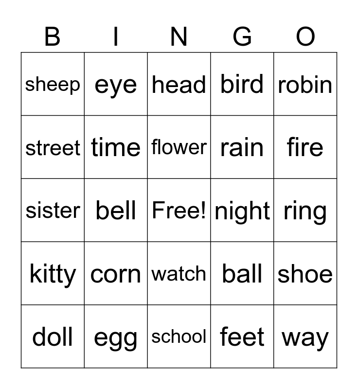 This bingo card has a free space and 24 words: corn, egg, flower, doll, robin, sheep, street, eye, night, watch, rain, sister, ball, shoe, time, feet, ring, head, fire, bell, way, kitty, bird and school.
